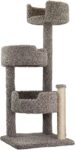 68-inch tall plush-covered structure, sisal scratching posts, smokey grey finish, stable.
