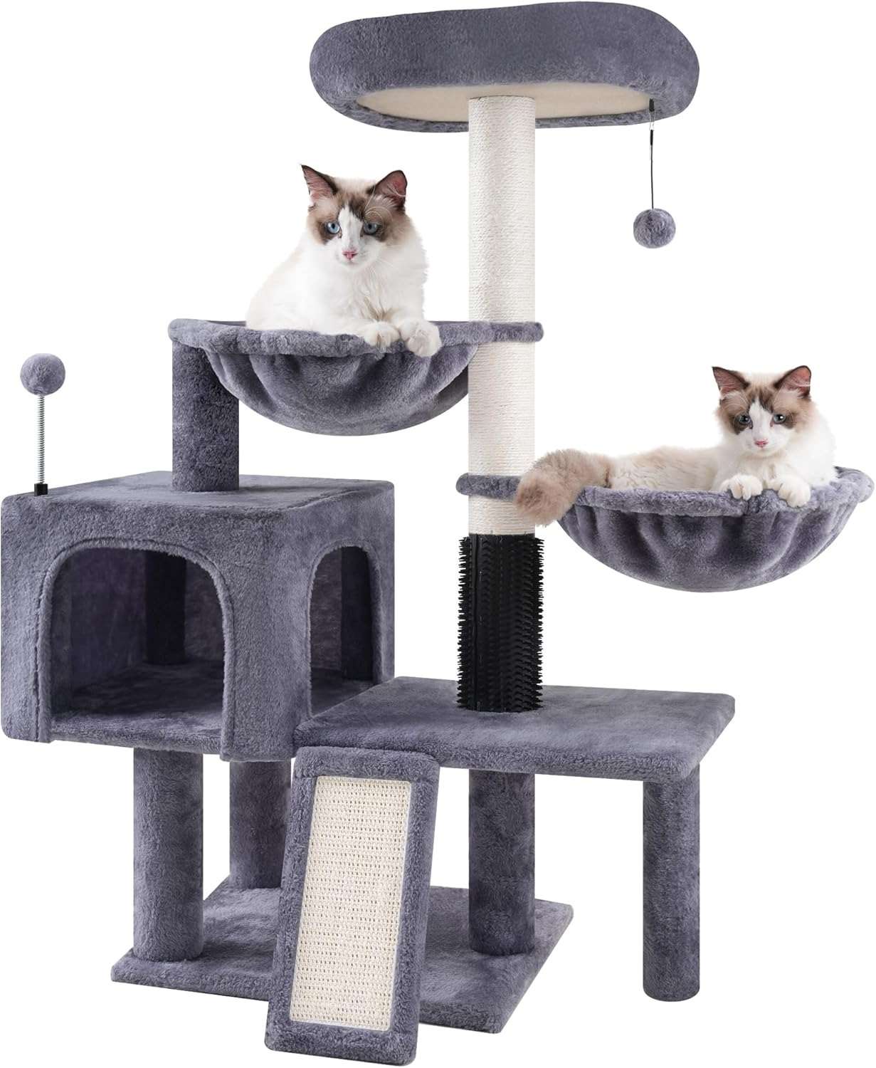 54-inch tall plush structure, sisal posts, condo, dangling ball, dark gray/white.